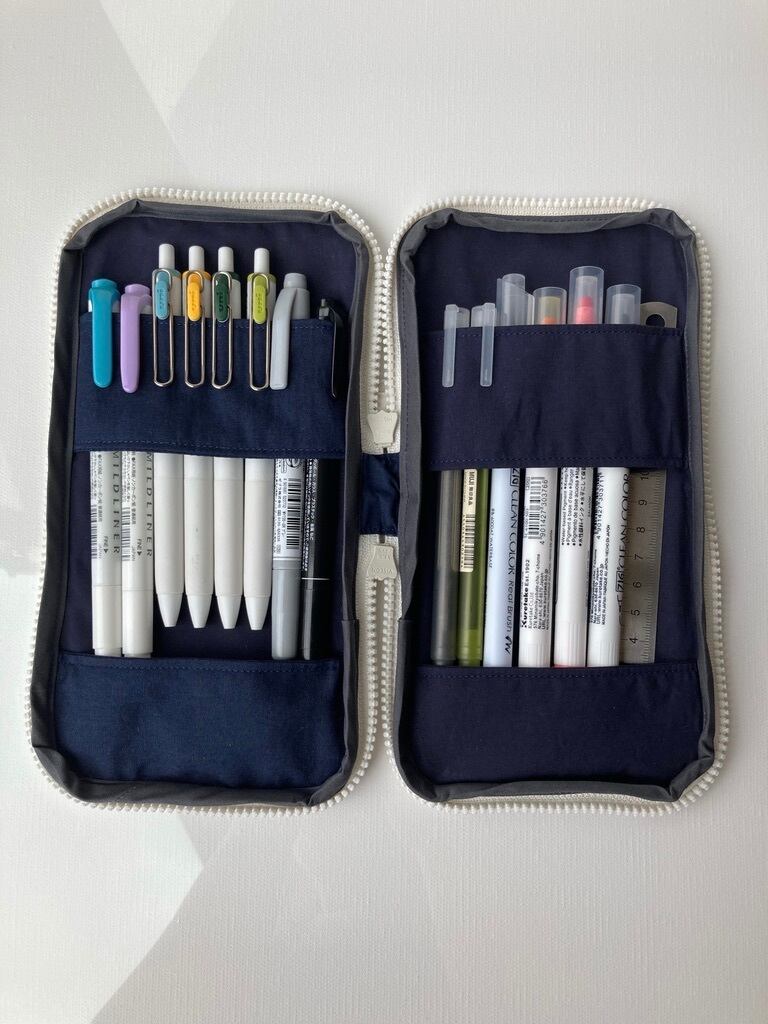 左右にペンや鉛筆が7本ずつ、万年筆や修正テープなどが重ならず、かさばらず持ち運べます。