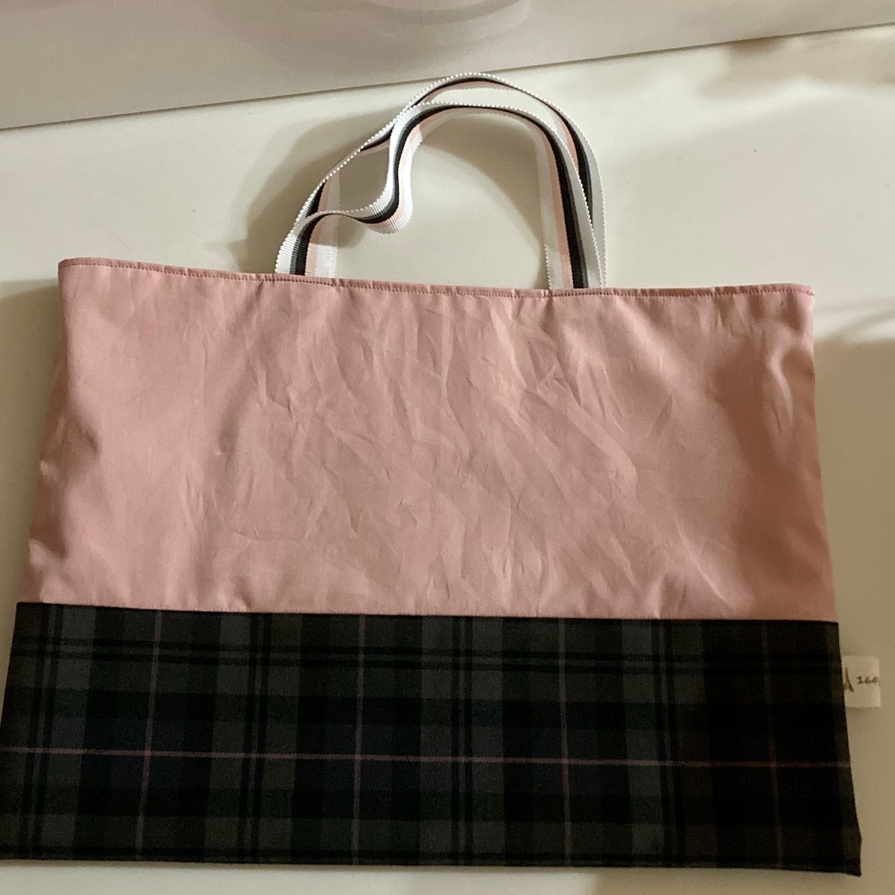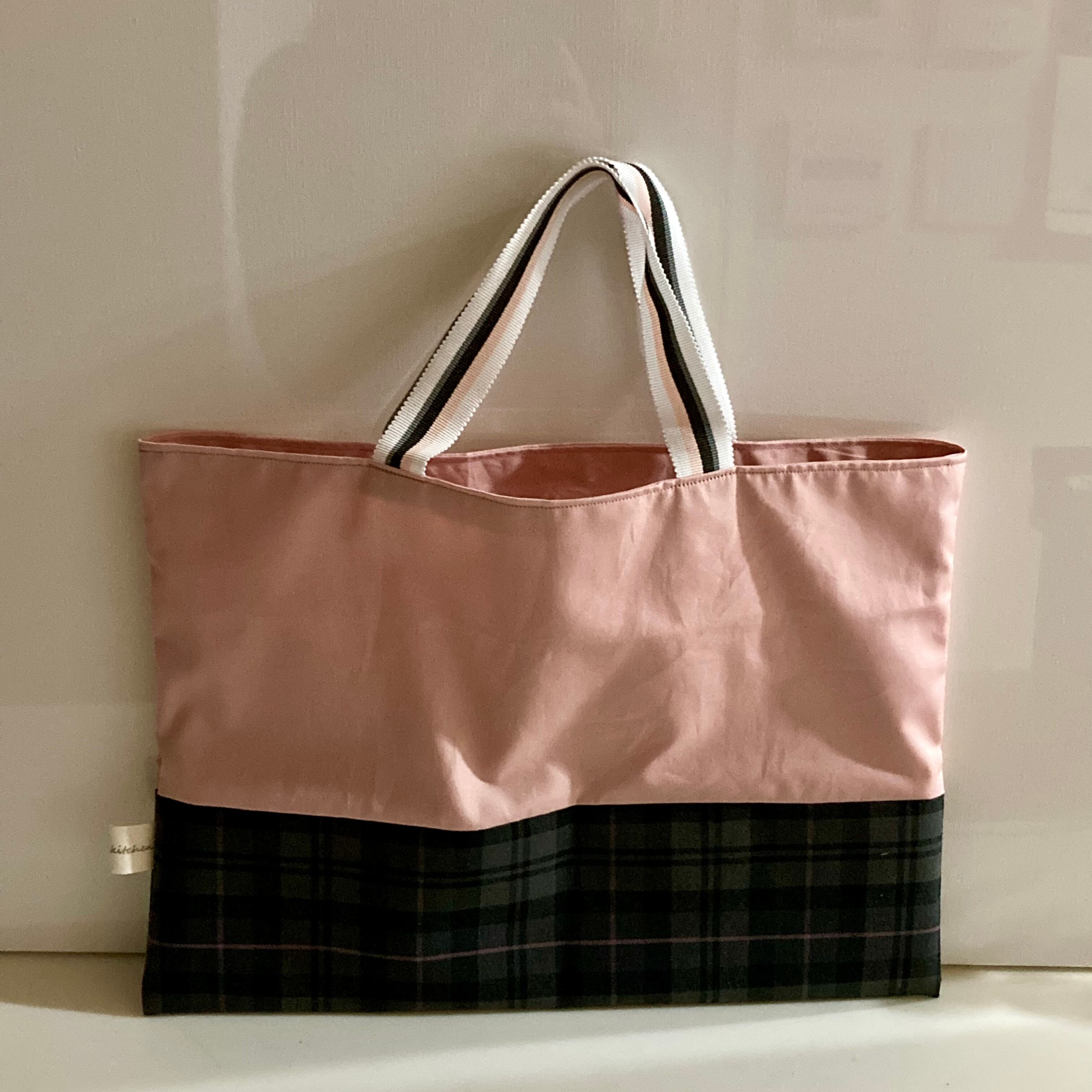 タータンチェックはグレーにピンクのラインが入っていて、合わせる生地を色味を落としたピンクにして大人可愛いい感じな手提げです☆