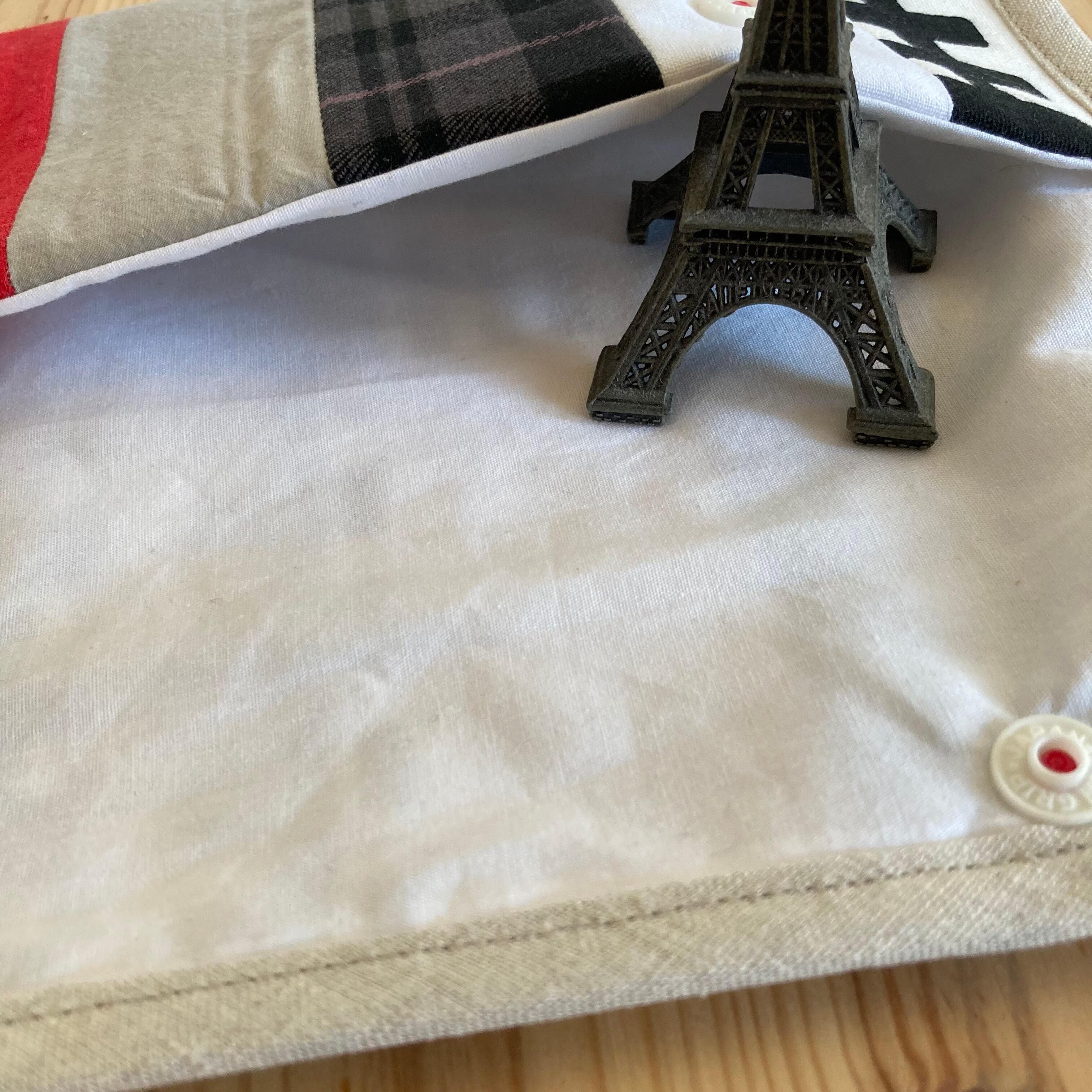 モノトーンをベースに赤を差し色にしたパッチワーク仕上げです。
